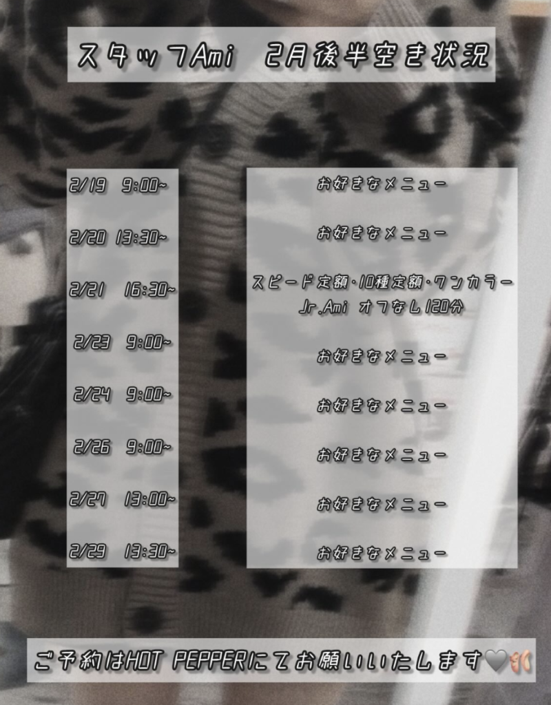 スタッフAmi 2月後半の空き状況 2024.02.17 ブログ スタッフAmi 2月後半の空き状況 ↓ご予約は https://beauty.hotpepper.jp/kr/slnH000670717/… Tweet Share さむ〜い時は指先からあったかく♡ 前の記事 一緒に働いてくれるスタッフを募集しております。 次の記事