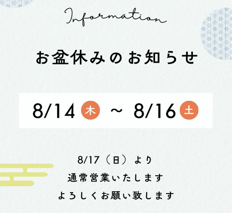 お盆休みのお知らせ 2025.08.14 お知らせ ブログ 誠に勝手ながら、お盆休みとさせていただきます。 Tweet Share 8月の定額ネイル《Akane限定デザイン 》です 前の記事 9月の定額ネイル《 Waka限定デザイン 》です。 次の記事