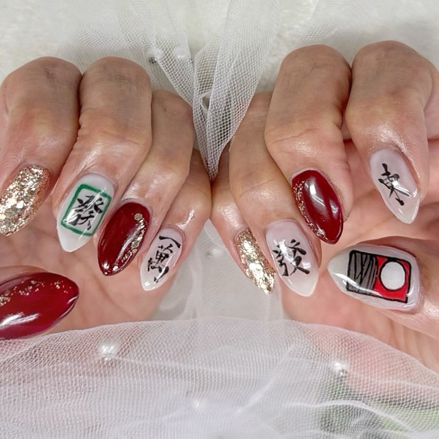 A customer asked me to create nail art using mahjong tile characters, so I wrote them in calligraphy.